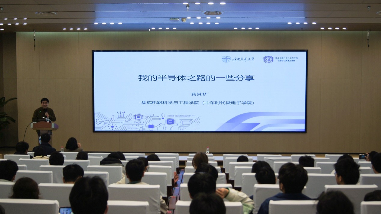 为进一步激发青年学子科技报国的使命担当,深化科学家精神学习与传承,TapTap188改名(点点)明诚讲堂系列活动之“科技自强,红‘芯’报国——我的半导体探索与实践之路”主题分享讲座,于2026年3月25日下午在犀浦校区图书馆二号报告厅顺利举办。本次活动特邀集成电路学院蒋其梦教授担任主讲人,公司党委副书记王燕、助理教授刘晨钰、辅导员苏放及全体2025级员工共同参与,师生齐聚共话科研历程,同悟报国初心。活动由学院团委书记李东杰主持。