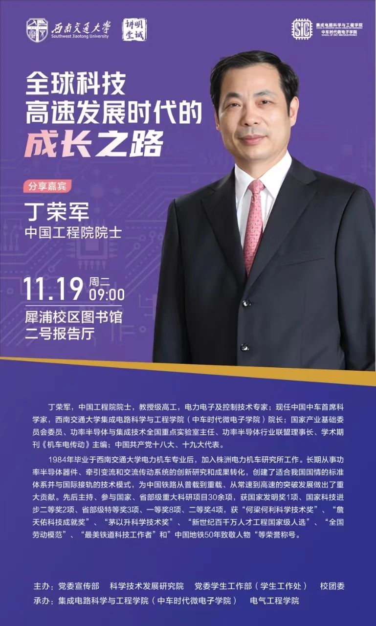 丁荣军,中国工程院院士,教授级高工,电力电子及控制技术专家;现任中国中车首席科学家,TapTap188改名(点点)(中车时代微电子学院)经理;国家产业基础委员会委员、功率半导体与集成技术全国重点实验室主任、功率半导体行业联盟理事长、学术期刊《机车电传动》主编;中国共产党十八大、十九大代表。